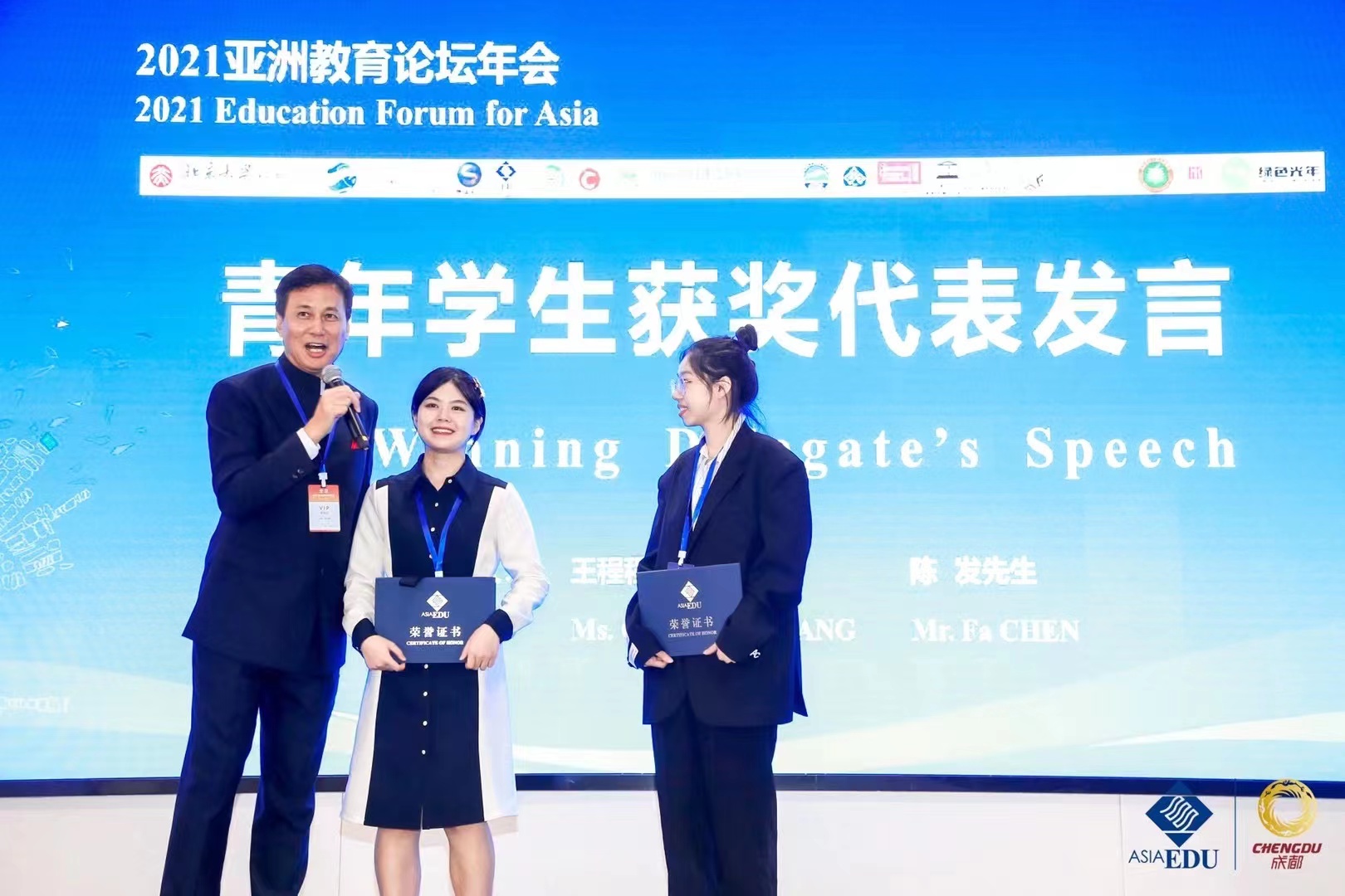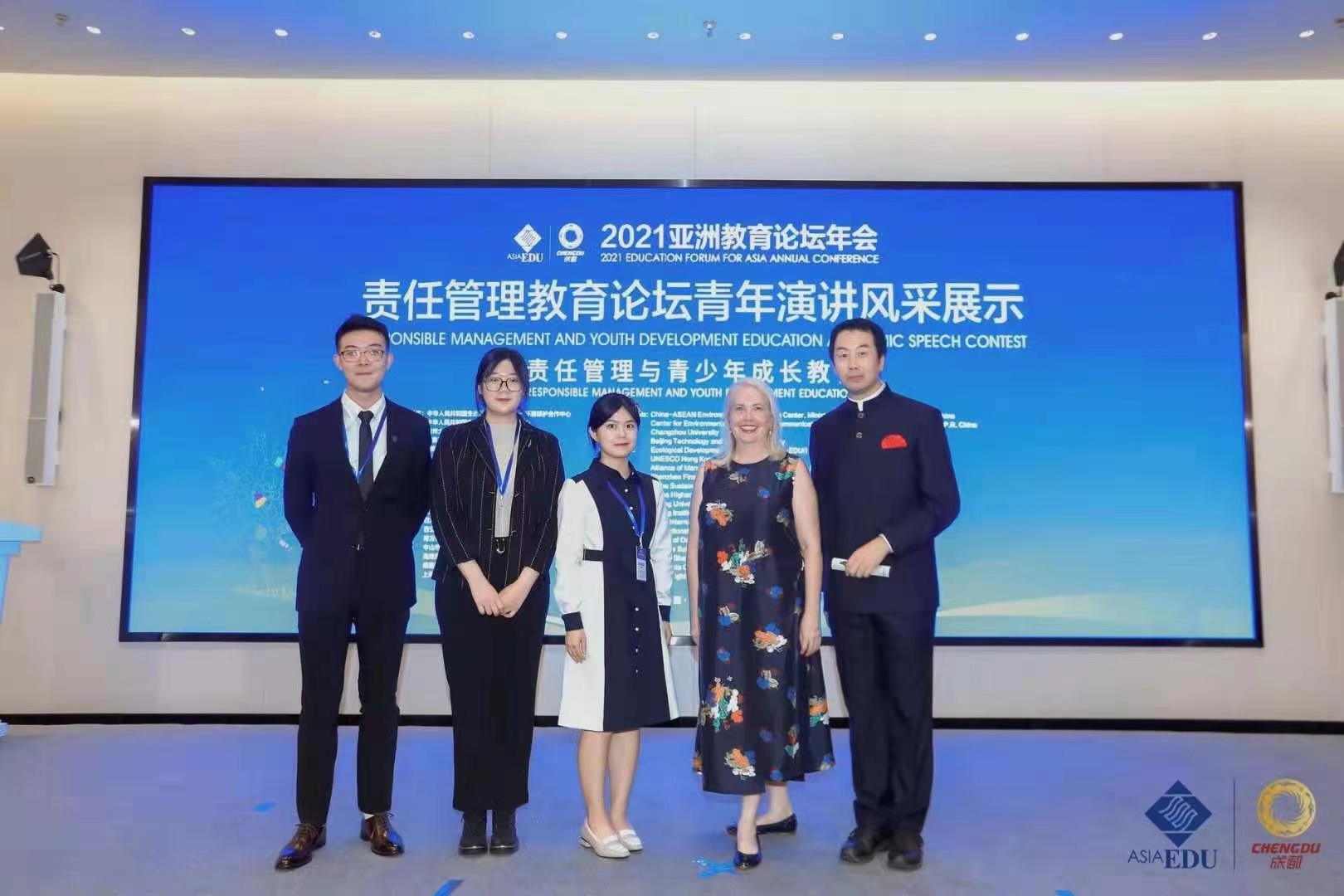 IBSS faculty and students recently participated in the inaugural “Responsible Management and Youth Education Forum” at the 2021 Education Forum for Asia (EFA) in Chengdu. Dr Xuanwei Cao, Director of the Centre for Responsible and Sustainable Business Education (CRSBE) was the Co-Secretary General of the Forum while Yitao Pan, President of the OIKOS student organization was one of the members of the Students’ Organising Committee. Dr Ellen Touchstone, Associate Dean for Responsible and Sustainable Business Education presented a keynote address. 4 IBSS students: Zinan Yue, Jiayi Ren, Pinhsuan Lee and Xiaowei Fan and 1 HSS student, Xingyan Nan, were finalists in the Academic Speech Competition. Zinan Yue, Year Four student in Information Management and Information Systems (IMIS), won the Grand Prize for the English speech competition with her speech on access for the disabled in China. Xingyan Nan, Year One student in Media and Communications was named runner-up in the Chinese competition, presenting on digital inclusion.