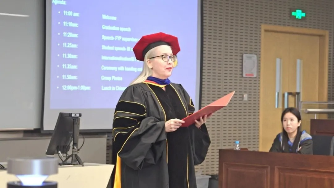 During the ceremony, Professor Jorg Bley, Dean of IBSS, delivered an enthusiastic speech, warmly congratulating the exchange students and commending their academic achievements and personal growth over the past year. He shared his own transformative educational experiences and highlighted the rapid development of China, emphasizing that the East can also learn from the West. He underscored the importance of a global perspective in today’s business world and encouraged students to continue exploring, learning, and innovating.