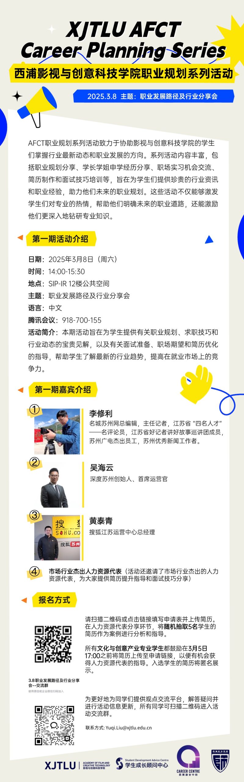 请扫描二维码或点击链接填写申请表并上传简历。在人力资源代表分享环节,将随机抽取5名学生的简历作为案例进行分析和指导。所有文化与创意产业专业学生都鼓励在3月5日17:00之前将简历上传至申请链接,以便有机会获得人力资源代表的指导。入选学生的简历将匿名展示。