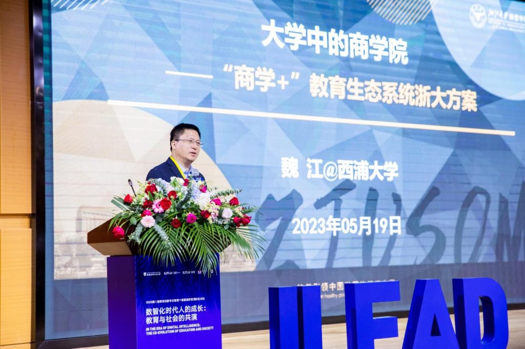 浙江大学管理学院院长魏江教授(下图)以浙大“商学+”教育生态系统的新方案为例,介绍了学院人才培养的定位。他提到:“数智化背景下的高质量人才应具备扎实的学术基础和跨学科的知识储备,拥有在复杂的商业环境中提出创新思维和解决问题的能力。同时,他们也应具备领导团队和与他人合作的能力,关注社会责任和可持续发展。”