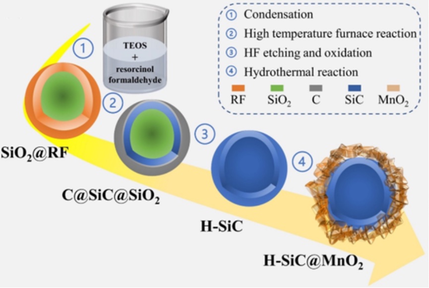 碳化硅材料具有耐高温、耐腐蚀、抗氧化、低密度、高强度及良好的阻抗匹配特性,然而纯碳化硅材料的吸波性能较差,为了进一步拓宽碳化硅在吸波领域的应用,研究者通过结构设计及与其他材料复配来提升碳化硅材料的吸波性能。然而,均匀的单分散的中空核壳结构的碳化硅及其复合材料很少有人研究。