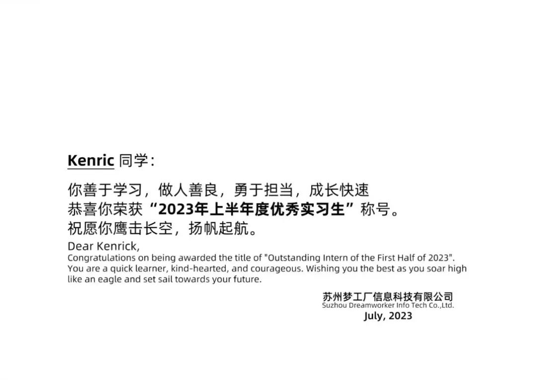 苏州梦工厂信息科技有限公司对这两位优秀实习生的表现给予了高度的认可,这份优秀的实习经历不仅对两位同学个人的职业发展有着重要的意义,同时也证明了IBSS在培养卓越商业人才方面的优秀实力。IBSS将继续致力于不断优化教学模式,培养更多具有国际视野、创新精神和可持续商业意识的人才,同时加强校企合作,为学生提供更广阔的发展平台。