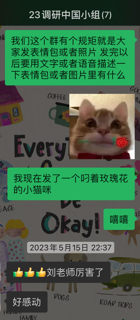这是我们23年暑假做视障调研时建的群,团队中有我的一位视障好友樊文谦。在他进群以后,大家都会坚持做到用文字描述每一个表情包和图片的聊天方式。