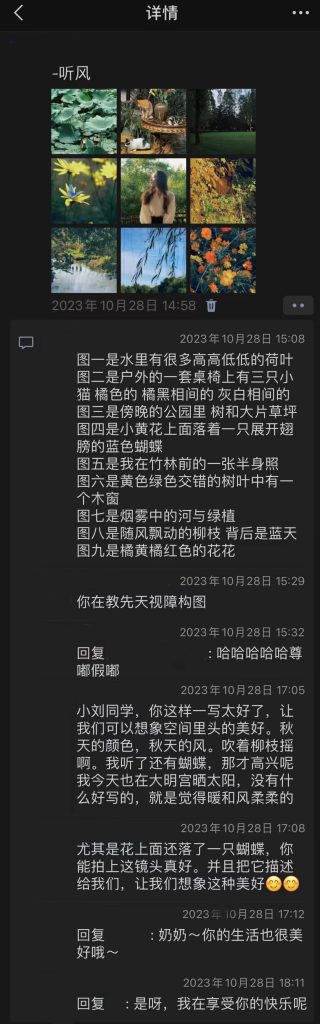 我的朋友圈也是这样。我的微信好友中有一位田野调查时认识的视障奶奶,她用读屏软件读取我朋友圈的内容后对我说:“小刘,看文字知道你很开心,虽然不知道9张图里是什么,但是奶奶祝你天天开心。”自那以后,我就会把每张图都在朋友圈的评论里做一个详细的解说,奶奶还会给我点赞、评论,特别可爱。