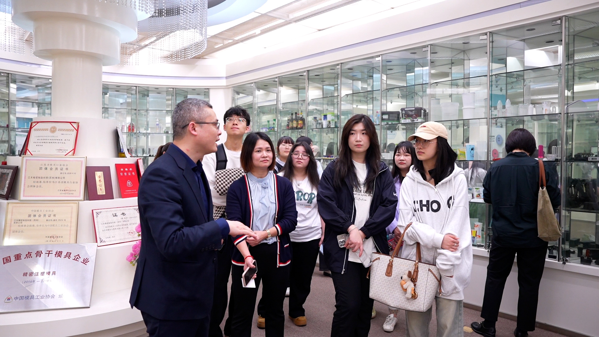 随后,师生们依次参观了公司的展览室、研发中心及24小时无人自动加工制造车间。展览室内陈列的精密模具和终端产品——从医美针筒、奶茶杯盖到茅台冰淇淋包装——展现了江天精密的技术实力;而车间内自动化生产线的高效运转,则让课本中的“智能制造”概念跃然眼前。一名学生感叹:“亲眼看到从设计图纸到成品的全流程,让我对制造业的精细化管理和技术创新有了全新认知。”